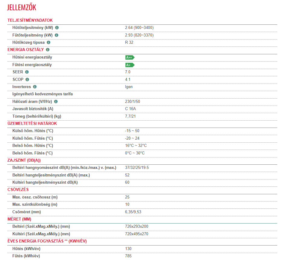 Felszerelés és beüzemelés díja bruttó 55.000 Ft, mely tartalmazza a kiszállást, a készülék helyszínre szállítását, a kültéri és beltéri egység felszerelését, elektromos betáp kiépítését aljzatba max. 5 méterig*, a kültéri tartókonzolt, rögzítő elemeket, a vákuumozást, a berendezés beüzemelését és azzal kapcsolatos dokumentumok kitöltését (pl.: beüzemelési jegyzőkönyv, garanciajegy...), valamint a takarítást.