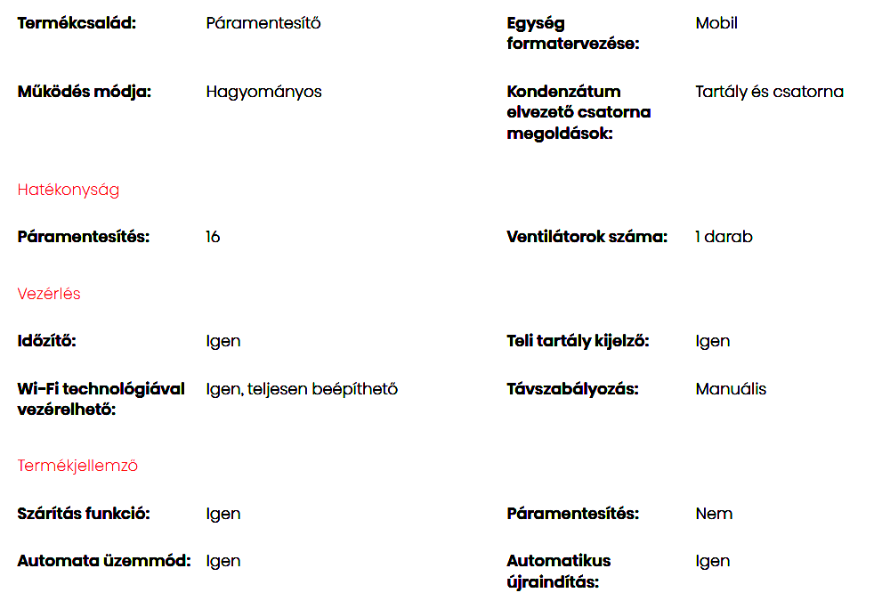 A Hisense D16HW Páramentesítő (16L/nap) fontos tulajdonságai: